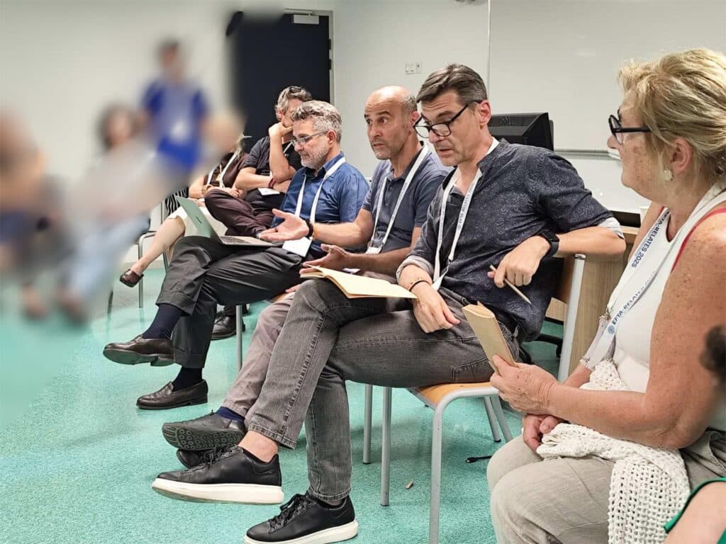 Το workshop με τίτλο “Η αυτοσχεδιαστική μουσική ως ζωντανό σύστημα- εξερευνώντας δυναμικές οικογένειας και ομάδας μέσω μίας αναλογίας στη μουσική” πραγματοποιήθηκε στο πλαίσιο του συνεδρίου της EFTA στη Lyon την Πέμπτη, 28/8 στις 5:15 – 6:15. Σε αυτό συμμετείχαν συνολικά 24 άτομα. Αφού γνωριστήκαμε, συνδεθήκαμε αφήνοντας να αναδυθεί ο προσωπικός, εσωτερικός ρυθμός του κάθε μέλους και φτιάχνοντας το κοινό-ρυθμικό “κολάζ” της ομάδας. Ακολούθως, η ομάδα συντονιστών παίξαμε έναν μουσικό αυτοσχεδιασμό (δύο κιθάρες και ένα τύμπανο) για 5′ και ζητήσαμε από τα μέλη να δουλέψουν σε μικρές ομάδες και να συζητήσουν πώς ένιωσαν στη διάρκεια του αυτοσχεδιασμού, ποιο κοινά στοιχεία ή αρχές εντόπισαν ανάμεσα στον αυτοσχεδιασμό και τη θεραπευτική διεργασία και να φέρουν στην ολομέλεια κοινές δια-πιστώσεις, παρατηρήσεις ή/και ερωτήματα.