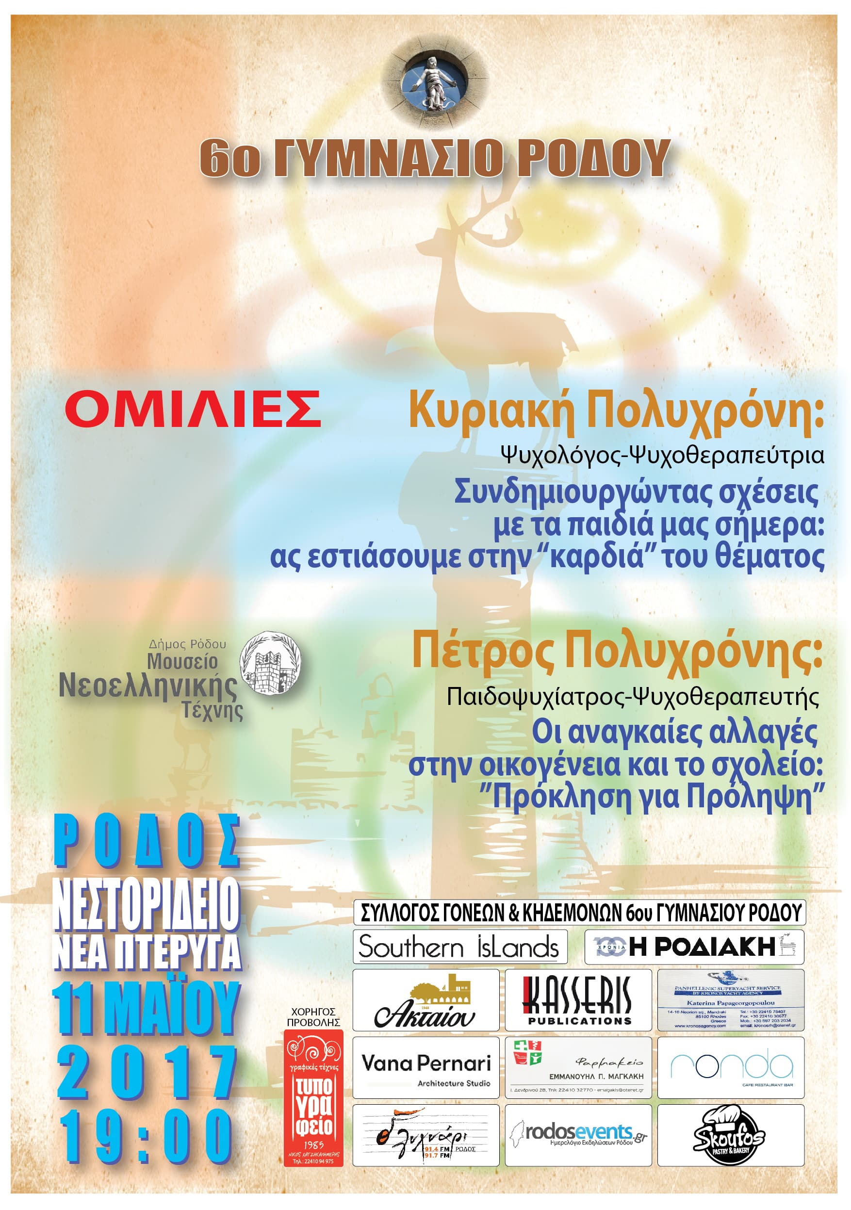 Με άνοιγμα στην κοινότητα της Ρόδου, καλώντας σε διάλογο εφήβους, γονείς και εκπαιδευτικούς, ο Σύλλογος Διδασκόντων του 6ου Γυμνασίου Ρόδου με τη στήριξη του Συλλόγου Γονέων & Κηδεμόνων, οργανώνει ανοιχτή εκδήλωση, με προσκεκλημένους τον Πέτρο Πολυχρόνη, Παιδοψυχίατρο – Ψυχοθεραπευτή, Διευθυντή του ΑΚΜΑ και την Κυριακή Πολυχρόνη, Ψυχολόγο, Ψυχοθεραπεύτρια Ζεύγους, Οικογένειας και Ομάδας, Εκπαιδεύτρια και Επόπτρια Ψυχοθεραπευτών.