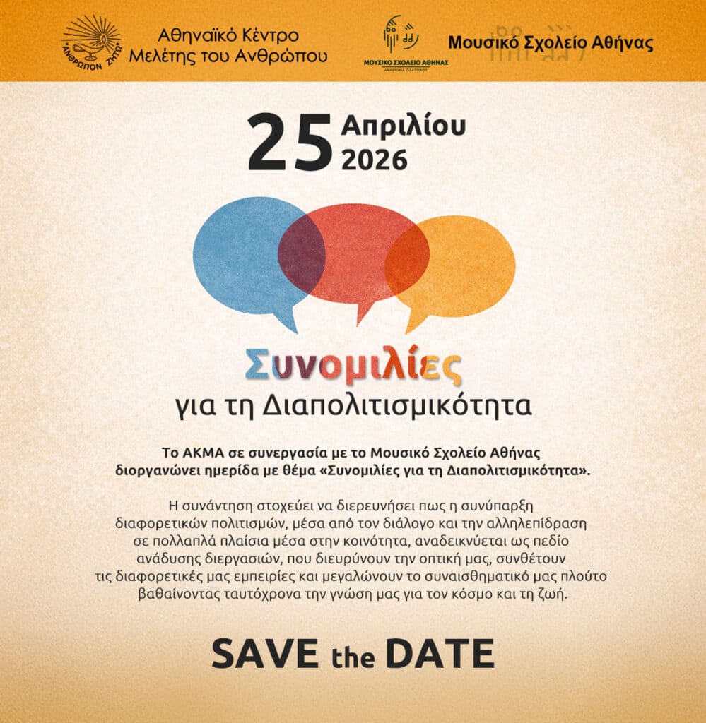 Το Αθηναϊκό Κέντρο Μελέτης του Ανθρώπου (ΑΚΜΑ) σε συνεργασία με το Μουσικό Σχολείο Αθήνας διοργανώνει την ημερίδα «Συνομιλίες για τη Διαπολιτισμικότητα», το Σάββατο 25 Απριλίου, 10:00–17:00, στον χώρο του Μουσικού Σχολείου Αθήνας (Δράκοντος 37, Ακαδημία Πλάτωνος).