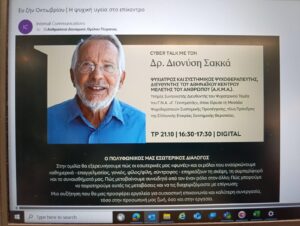 Στο πλαίσιο των δράσεων του Αθηναϊκού Κέντρου Μελέτης του Ανθρώπου (Α.Κ.Μ.Α.) για την προαγωγή της ψυχικής υγείας και της συνεργασίας μέσα στους οργανισμούς και τις επιχειρήσεις, ο Διευθυντής του ΑΚΜΑ κ. Διονύσης Σακκάς, θα πραγματοποιήσει ψηφιακή ομιλία (Cyber Talk) για τα στελέχη της Τράπεζας Πειραιώς, με θέμα: